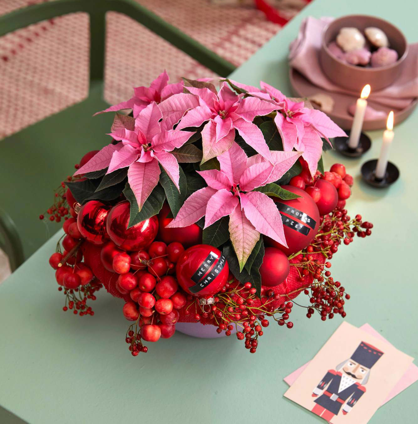 Декорирана рамка от сламен венец превръща обикновена купа, пълна с розови мини коледни звезди, в изискан подарък само за миг.