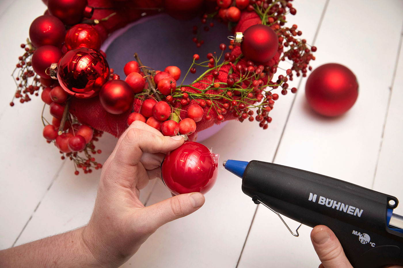 Ето как да го направите: Увийте венеца с панделката. Разположете шипките свободно около него и ги фиксирайте с декоративната тел. Прикрепете ябълковите клонки с помощта на карфици. Поставете венеца върху ръба на купата и залепете коледните топки с топъл силикон. Накрая засадете коледните звезди в купата.