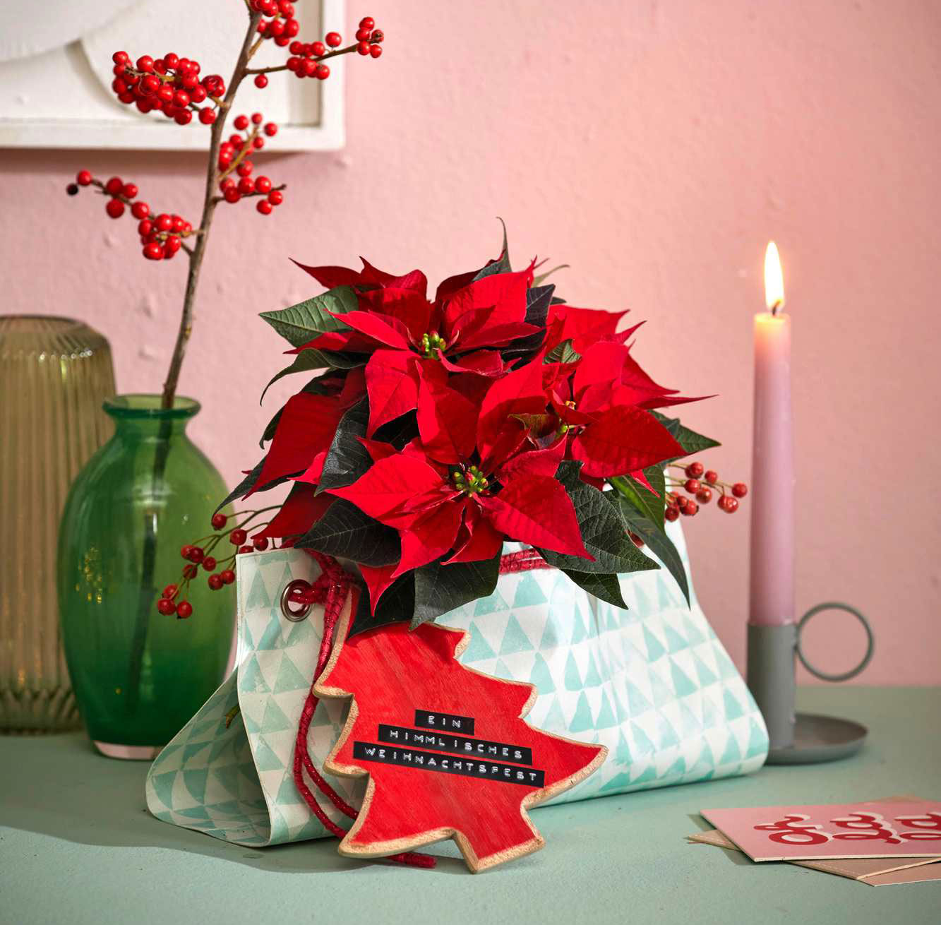 Една пищна червена коледна звезда се превръща в изискан подарък, когато е поставена в домашно направена торбичка от остатъци от тапети, например. Дървен етикет с лично послание и декоративни клонки от шипка добавят топъл, ръчно изработен акцент – идеално решение за хора, които ценят уникалните предмети, направени с внимание и любов.
