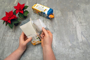 Необходими материали: дървена дъска за основа, няколко празни картонени опаковки, мини коледни звезди, малки декоративни ябълки, клонки от лиственица, мъх, LED чаени свещи на батерии, мини декоративни елхички, молив, макетен нож/ножица, четка и латексна или акрилна боя, пистолет за топъл силикон и силиконови пръчки