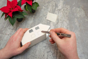 Стъпка 2: С молив очертайте покривите, прозорците и вратите, след което ги изрежете внимателно. Освен затворени къщички с място за електрически чаени свещи, можете да направите и отворени варианти. При тях се използва само едната страна като фасада, а останалите три оформят отворен контейнер – идеален за поставяне на мини коледни звезди.